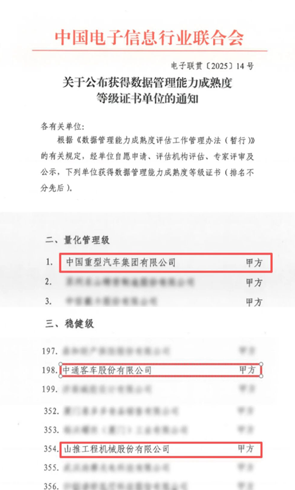 近日,由國(guó)家工業(yè)和信息化部指導(dǎo),中國(guó)電子信息行業(yè)聯(lián)合會(huì)發(fā)布了《關(guān)于公布獲得數(shù)據(jù)管理能力成熟度等級(jí)證書單位的通知》,山東重工旗下中國(guó)重汽獲得國(guó)家數(shù)據(jù)管理能力成熟度“量化管理級(jí)”(4級(jí))認(rèn)證,山推股份與中通客車獲得“穩(wěn)健級(jí)”(3級(jí))認(rèn)證,標(biāo)志著集團(tuán)數(shù)據(jù)管理能力總體處于制造業(yè)領(lǐng)先水平。
