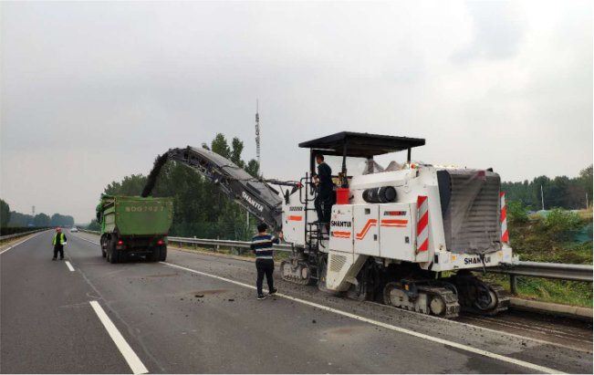 京臺高速擴建工程,原有的高速路面一次銑刨18公分,行走速度可達8-10m/min。銑刨后路面平整度高,刮料干凈。
