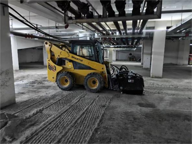 近日,在天津市河西區(qū)某高端住宅小區(qū)的地下車庫施工現(xiàn)場,一臺山推SSL75V-M滑移裝載機正有條不紊地進(jìn)行地面銑刨拉毛作業(yè)。作為該項目地下車庫施工中的核心設(shè)備之一,SSL75V-M憑借其靈活機動的作業(yè)能力、卓越的多功能屬具配置和高效穩(wěn)定的施工表現(xiàn),為客戶解決了效率低、空間受限等施工痛點。