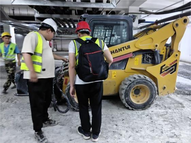 項目啟動后,山推技術(shù)團隊為客戶量身推薦了SSL75V-M滑移裝載機,配置快換銑刨鼓及清掃器等屬具。面對地庫內(nèi)2.1米的高度限制,SSL75V-M整機高度僅2065mm,轉(zhuǎn)向靈活,在狹小空間內(nèi)表現(xiàn)出色;配套的大流量屬具液壓系統(tǒng),保障了銑刨鼓的動力輸出,在硬質(zhì)水泥地面也能高效作業(yè),日均銑刨面積可達(dá)1000㎡,施工效率提升75%以上。