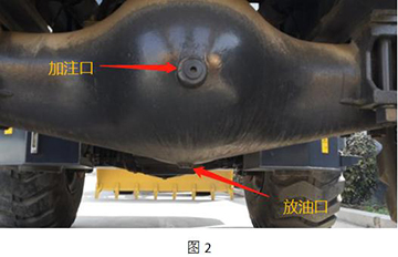 6、     工作完成后,將車輛停平穩(wěn),拉緊手制動,將前后橋的放油塞(圖2)堵拆下,放出橋包里的油液,用備用桶收集并妥善處理。將塞堵清理干凈。