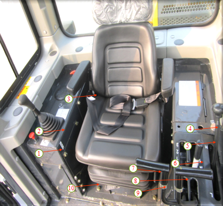 鏟刀鎖緊 2、鏟刀操縱 3、熄火拉線(xiàn) 4手油門(mén)操縱桿 5喇叭按鈕