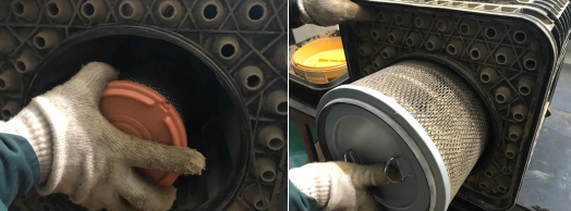 3、清理空氣濾清器一側(cè)的排灰閥,排除里面的灰塵。用氣槍清理濾芯時,要沿濾芯內(nèi)側(cè)向外側(cè)清理,切不可由外向內(nèi)吹(氣槍壓力在0.2MPa),請注意:濾芯在清理六次后應(yīng)進行更換。